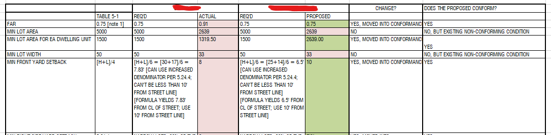 The "proposed" section is where you'll play with what you'd like to do in the project, and where you can keep an eye on where you might need variances. The "change?" section is where you can show the zoning official, very clearly, where you're making any changes. The goal of a zoning analysis is not just to figure out what's possible, but ultimately, to document what you did so that the zoning officer can clearly see it during their review. Confusion or lack of clarity is *not* helpful for your application!