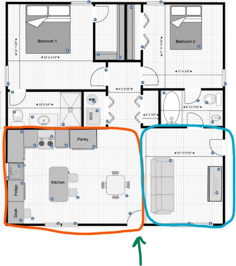 The location of what I think is the front door [green arrow below] splits the house into a smaller side [blue] and a larger side [orange]. Generally, you’d want the larger living space on the larger side - here, the living room is crammed on the smaller side, while the kitchen [which could be tighter] is taking up the larger side. We’ll try something different!