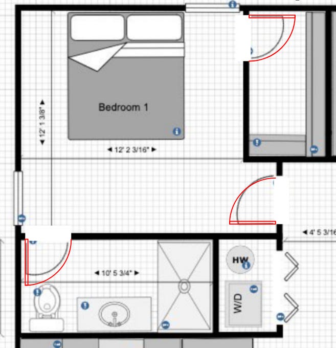 The doors are off. While the openings are the correct width, the actual door itself is drawn too short, giving false information about what kinds of doors fit in certain spaces. The primary bath door, for example, was drawn at about 26” [28” is needed for code, 30” is comfortable and is what is shown below]. The door into the primary bedroom had the right opening size, but didn’t have the right size door - it’ll stick further into the room than what’s shown. And same with the closet door - if we put a real door in, it’ll hit the clothes that are hanging on the rod.