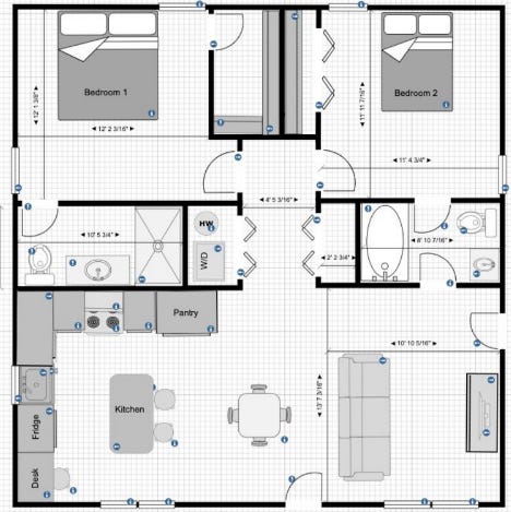 Some of the bathroom dimensions are funky. A standard bathroom can be 5’x8’, if you’re not dealing with formal accessibility requirements. In a small space, don’t give over extra space to bathrooms when you could use it elsewhere!